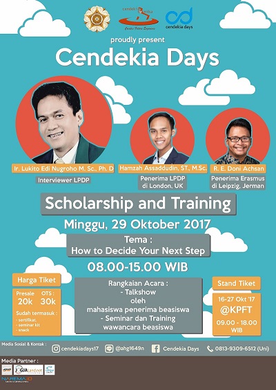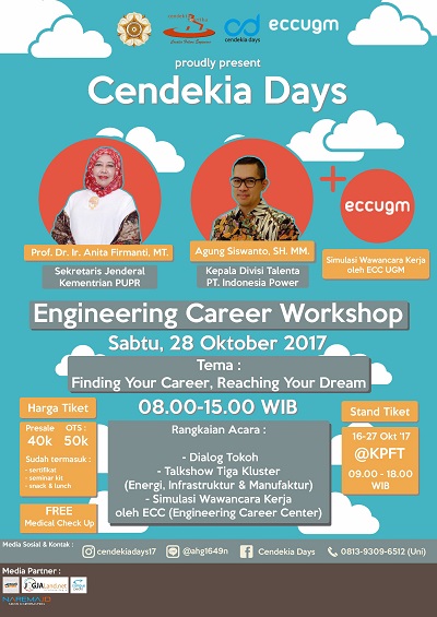 para mahasiswa. Acara ini memiliki tema ‘Createthe Ways to Your Future’ dengan makna bahwa setiap orang harus mempunyai berbagai cara sebagai batu loncatan dalam diri sendiri untuk menentukan karir dan pilihan di masa depan yang penuh dengan tantangan, sehingga ke depannya efek dari kegiatan ini bukan hanya sebagai pendorong agar kemampuan seseorang lebih berkualitas namun juga mampu mengaktualisasikan kemampuan tersebut dalam kehidupannya melalui pelatihan keterampilan atau softskill. Kegiatan ini digelar dalam suatu rangkaian acara, yang terdiri dari 3 acara besar yakni Engineering Career Workshop (ECW) danMedical Check Up, Scholarship and Training (SCORTING), dan Poster Competition Cendekia Days 2017.