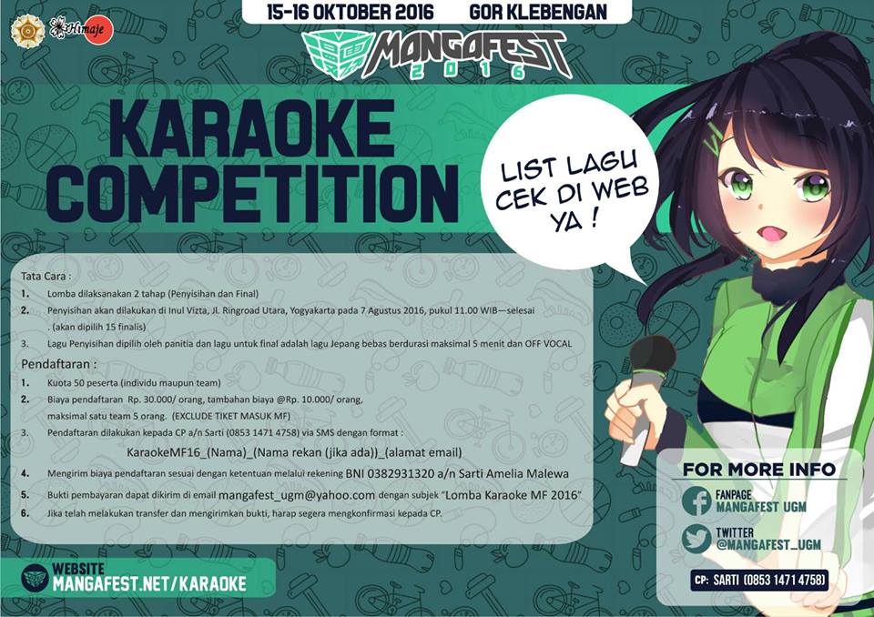 Info selengkapnya silakan cek dihttp://mangafest.net/competition-karaoke atau menghubungi CP kami (Sarti +6285314714758)