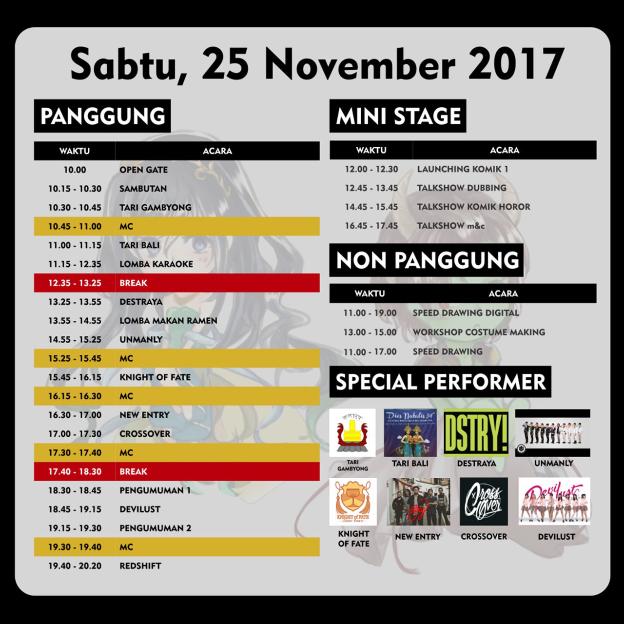 RUNDOWN MANGAFEST 2017 JogjaLand.net November 22, 2017 2528 views RUNDOWN MANGAFEST 2017 Selamat Malam! Ini dia yang ditunggu-tunggu! Jadwal acara MangaFest 2017 tanggal 25-26 November hari Sabtu dan Minggu! Buat yang pingin tahu bakal ada acara apa saja, silakan dibaca dan dicermati dengan seksama yah[ Shares/Shares on facebookTweet on twitter Mangafest 2017 « Previous PostMangafest 2017Next Post »IMMANTA PresentsAuthor: JogjaLand.netJogjaLandRelated PostKARNAVAL KAULA MUDA NEW STAND UP EXPERIENCE SHOW “GEN Z VS MILLENIAL”NEW STAND UP EXPERIENCE SHOW “GEN Z VS MILLENIAL”Tempat Event di Jogja: Menyelami Keberagaman Budaya dan SeniJogja, Kota Pelajar dan Kota Budaya, memancarkan pesona kekayaanWebinar Deal with Toxic RelationshipWebinar “How to Deal with Toxic Relationship” bersama Kak