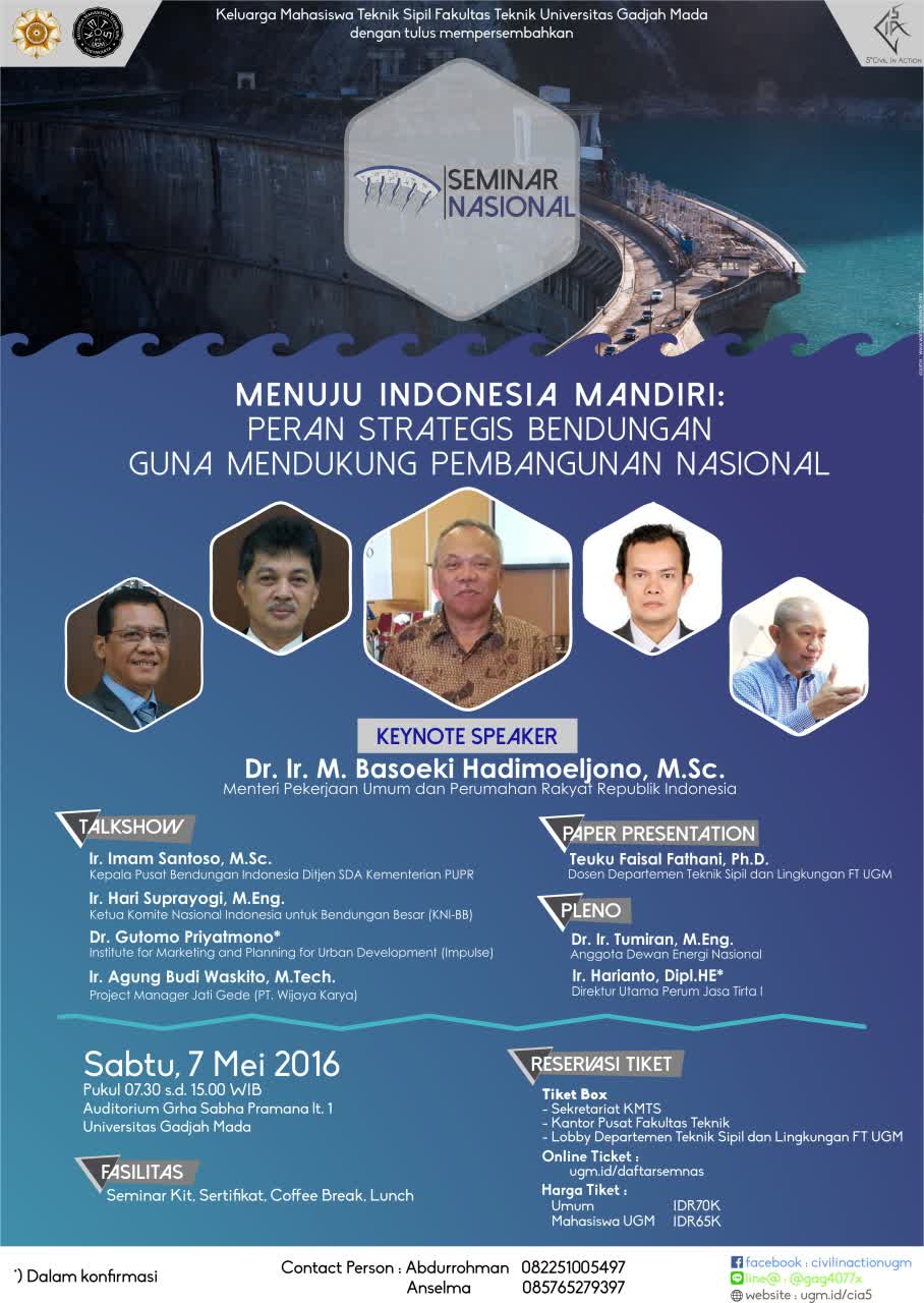 Melihat betapa pentingnya topik bendungan ini, Keluarga Mahasiswa Teknik Sipil, Departemen Teknik Sipil dan Lingkungan, Fakultas Teknik, Universitas Gadjah Mada, terinspirasi untuk mengangkatnya dalam acara Seminar Nasional bertemakan Menuju Indonesia Mandiri: “Peran Strategis Bendungan Guna Mendukung Pembangunan Nasional” sebagai salah satu acara yang terangkai dalamacara 5th Civil in Action yang bertemakan “Empowering Infrastructure Development Towards A Leading Nationâ€. Harapannya dengan adanya acara ini, acara ini mampu mengajak masyarakat untuk ikut serta berperan aktif dalam menyongsong Indonesia yang makmur dan sejahtera. Acara ini ditujukan sebagai wadah olah pikir dan karya para partisipan untuk melahirkan generasi yang inovatif dan kompetitif. Acara ini diharapkan dapat meningkatkan kesiapan para akademisi, praktisi, masyarakat, dan pemerintah untuk saling kerja sama menuju Indonesia yang lebih baik.