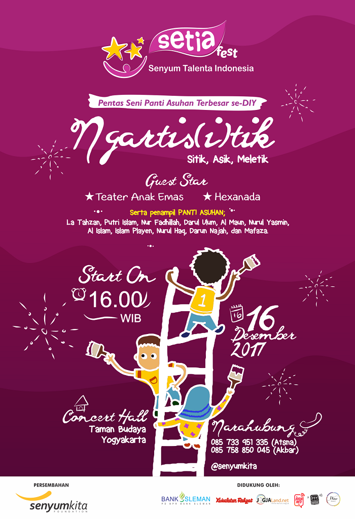 Senyum Talenta Indonesia (SeTIA) Fest 2017 mengusung tema “NGARTIS(i)TIK”. Sebuah kata yang bisa memiliki dua arti. Arti yang pertama terdiri dari penggabungan dua kata, yakni “Ngartis” dan “Sitik” yang memiliki arti “sedikit menjadi artis”, sedangkan arti kedua adalah plesetan dari kata “artistik” yang berarti sesuatu yang terkait dengan rasa terhadap seni. Singkatnya “NGARTIS(i)TIK” memiliki arti sedikit kesempatan untuk menampilkan potensi seni.